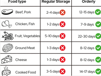 Our lab tests confirm that Orderly extends the lifespan of fresh produce and proteins by up to 500% compared to traditional storage methods.