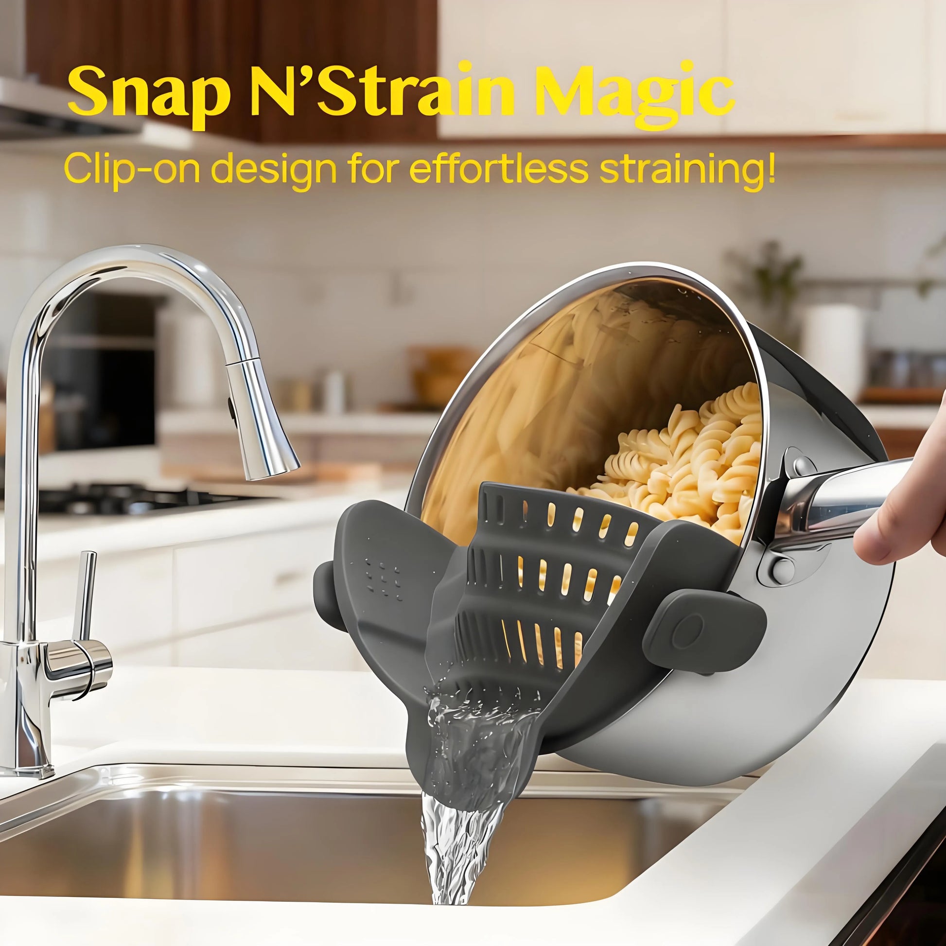 Snap-On Pasta Strainer – Heat Resistant, Space-Saving Colander for Pots & Pans